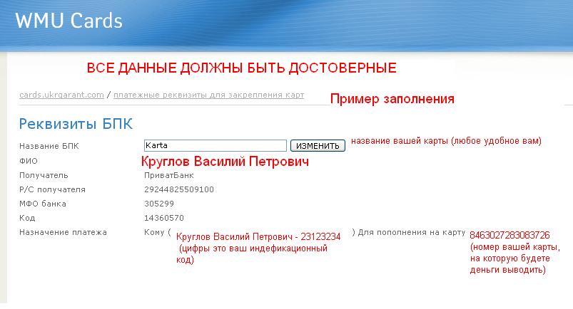 Вот пример, как я прикреплял свою карту к Приватбанку. Кто будет тоже через приватбанк выводить, то достаточно ввести данные, что выделены на примере красным: