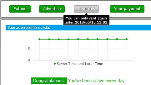 Итак заходим в личный кабинет. Над графиком вашей активности будет кнопка Refferals. Если она серая, значит арендовать нельзя и при наведении на нее будет писать причину. Например, на скриншоте ниже указано, что арендовать можно будет после 15 августа 2018 года, так как я недавно брал в аренду и еще не прошла неделя с тех пор. В общем жмем на зеленую кнопку Refferals и попадете в окно с выбором пакета с количеством арендованных рефералов.