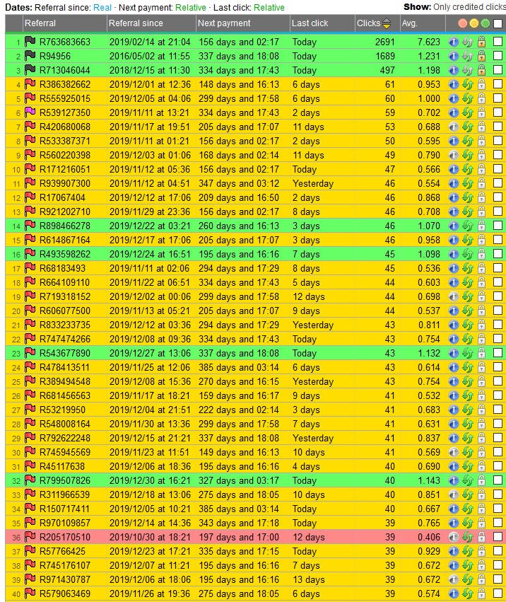 Спасибо огромное за развернутый ответ!!! Про прямых рефералов я не правильно высказался, в сводной я вижу только их количество, но что-то другое я с ними сделать не могу, к примеру удалить или посмотреть их клики. Если бы я не сделал 100 кликов они отображались бы? В помощи сказано 100 кликов и 15 дней, на сайте я уже давно, а про клики уточнений нет, желтые или любые…